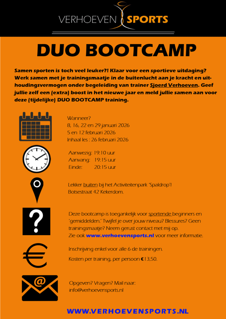 Deze duo-bootcamp zal tijdelijk gegeven worden en mogelijk, in het geval van genoeg animo, herhaald worden. Deze duo-bootcamp zal pas doorgang vinden als minimaal 10 toppers zich hebben aangemeld maar er is uiteraard plek voor meer. Plezier hebben, lachen, zweten, moe worden en voldaan naar huis gaan is verplicht. Opgeven kan niet voor een losse training maar enkel voor alle 6 de trainingen. Een gemiste les kan ingehaald worden op donderdag 26 februari 2026. De training op donderdag 26 februari mag je ook gebruiken als ‘extra training’. De trainingen zullen ook bij koud en nat weer lekker doorgang vinden! Geen trainingsmaatje? Geen probleem, geef je vooral op en ik koppel je aan iemand anders die ook alleen is. Opgeven kan tot uiterlijk 2 januari 2026 maar let op: vol = vol!! (20 pers) Meer info volgt na aanmelding per mail.